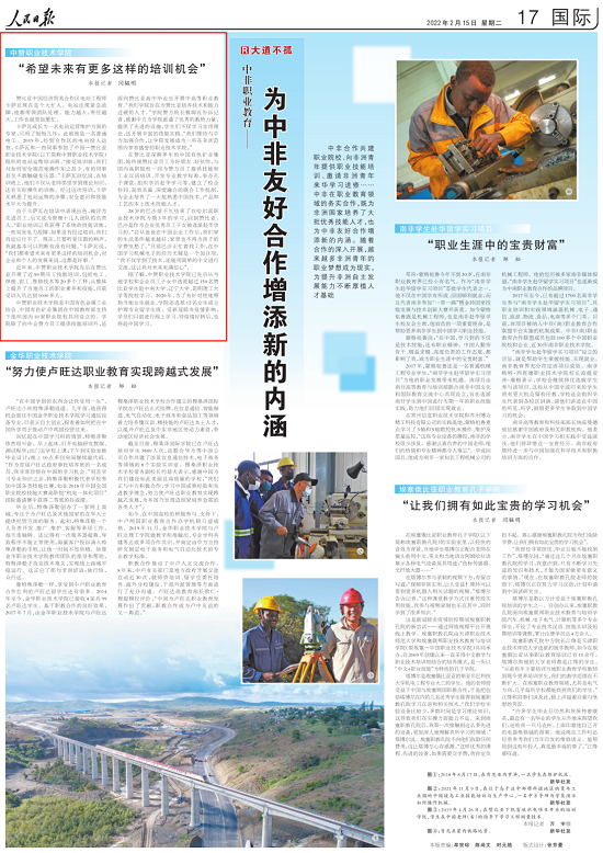 2022年2月15日出版的《人民日报》刊发题为《中非职业教育——为中非友好合作增添新的内涵(大道不孤)》文章,对中国有色集团推动我国职业教育“走出去”情况进行了报道(链接:http://paper.people.com.cn/rmrb/html/2022-02/15/nw.D110000renmrb_20220215_1-17.htm)。以下为报道全文: